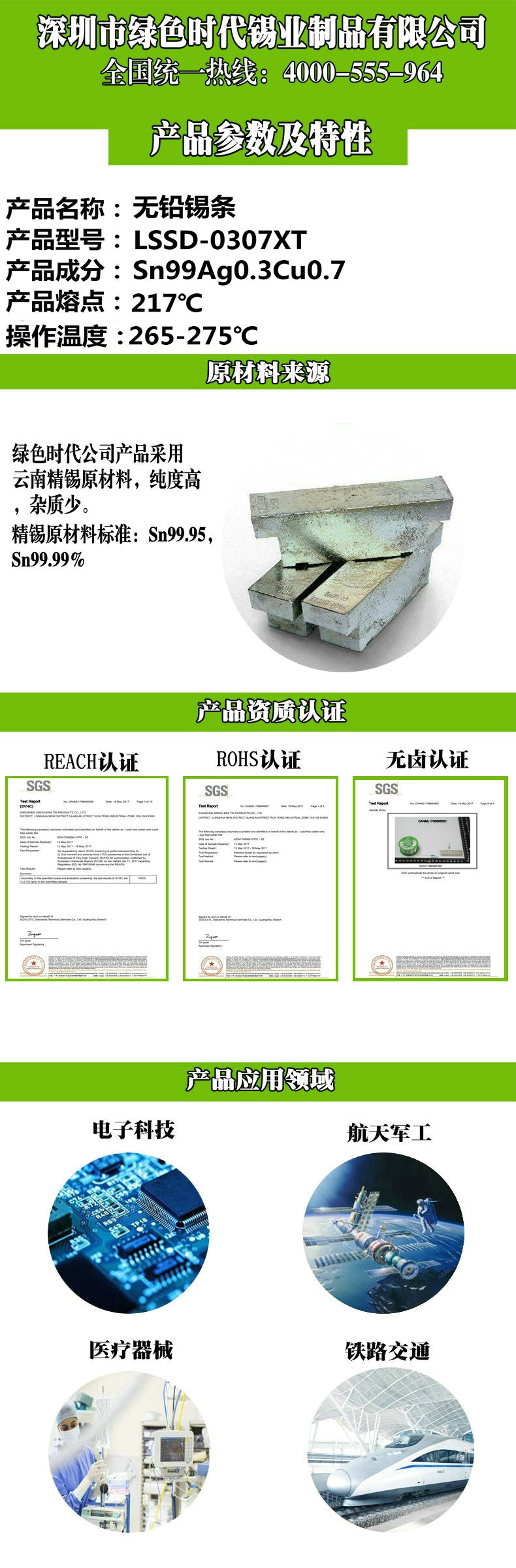 二、綠色時代牌Sn99Ag0.3Cu0.7無鉛錫條的特點: